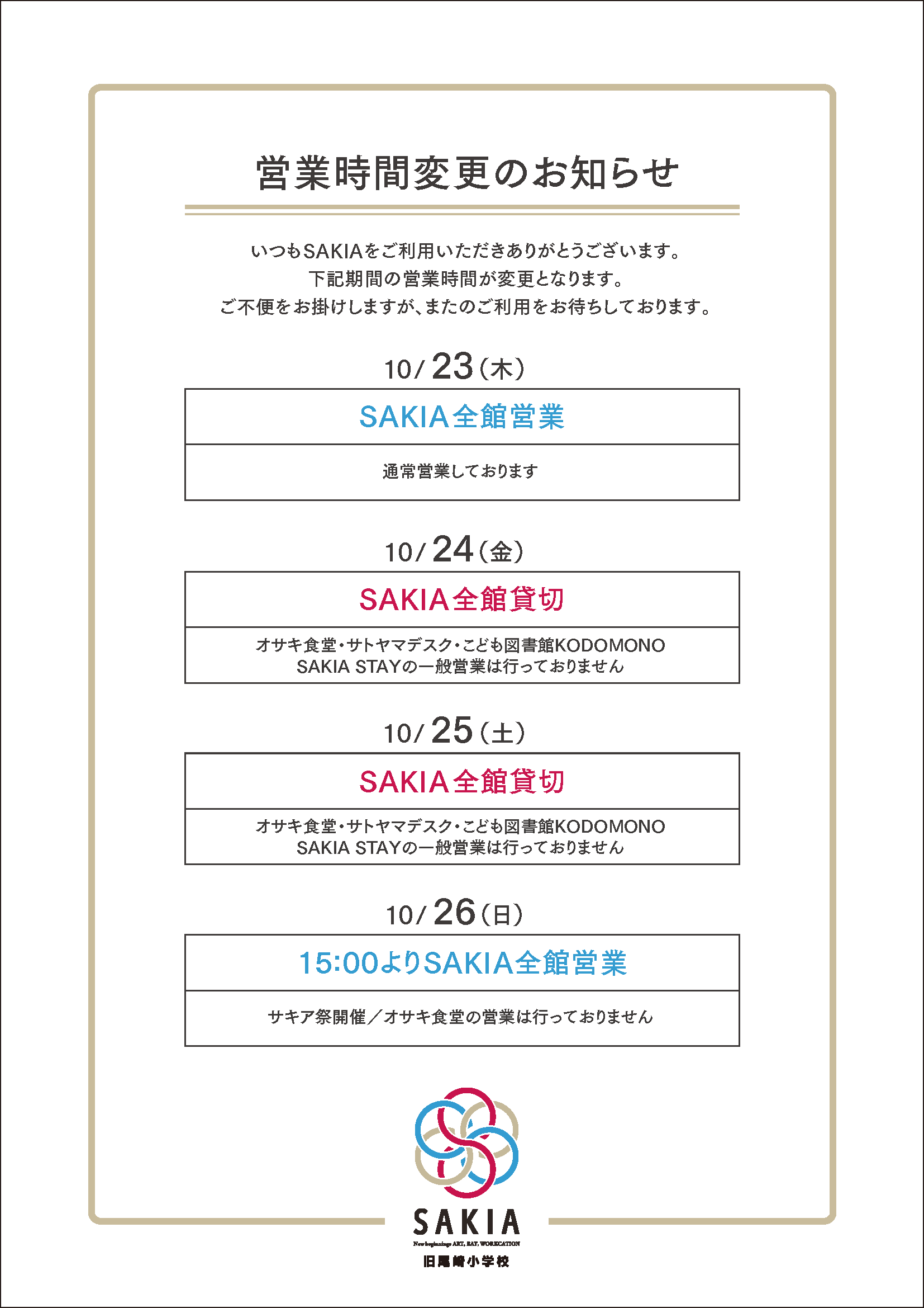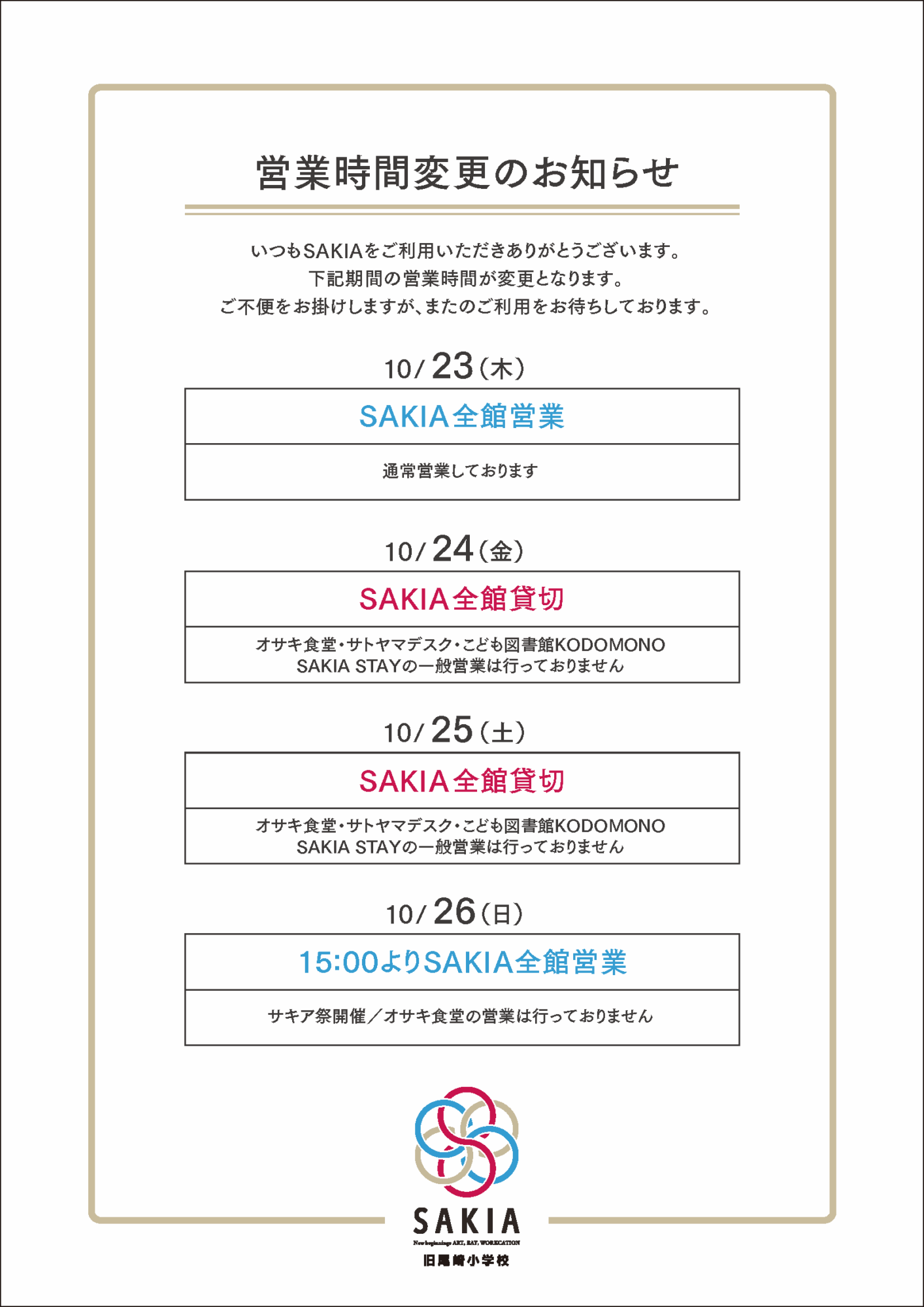 SAKIA 営業時間変更のお知らせ【 10/23〜26 】